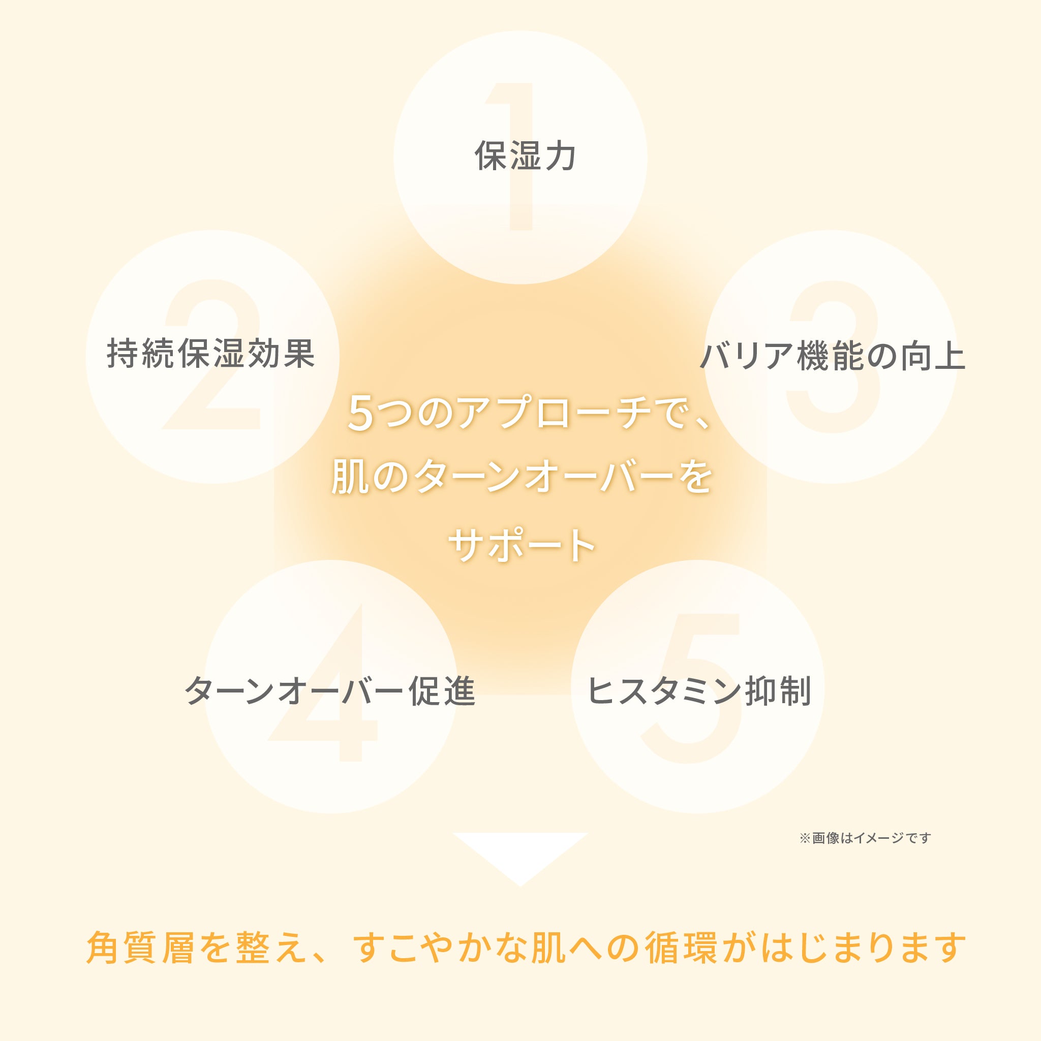 以下のMoist Hug 5つのこだわりに沿い、あなたのお肌のターンオーバーをサポートします。